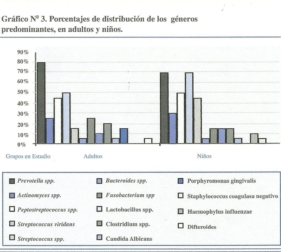 De un estudio publicado en la Revista Dental de Chile en 2004 (Leitao,Pedemonte y Basilli), puede distinguirse perfectamente entre las cepas predominantes en las infecciones dentales de adultos y niños. Como lo demuestran los gráficos, en abscesos odontógenos de los adultos hay predominio de las cepas anaeróbias y anaeróbias-aeróbias ( 85 % ), en cuanto a los niños, hay un predominio de las cepas anaeróbias-aeróbias ( 75 % ) y una absoluta ausencia de los aneróbios puros.